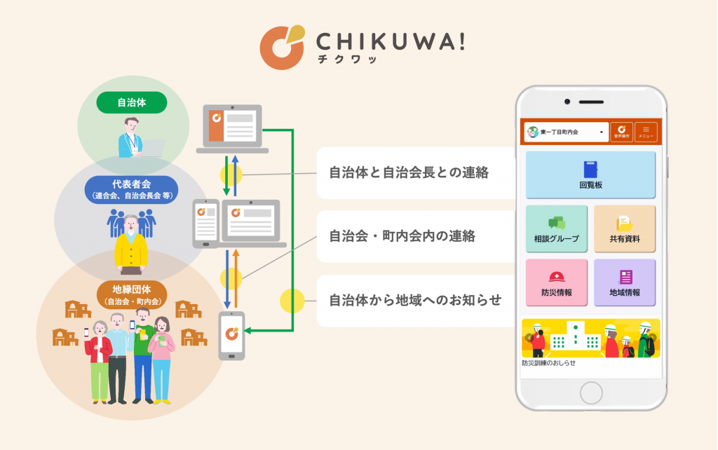「CHIKUWA!」は、自治会・町内会運営のデジタル化を支援する連絡ツールとして、自治体と自治会・町内会間における情報共有をはじめ、電子回覧板やアンケート、グループ掲示板など、団体運営に必要な機能を提供しています。
