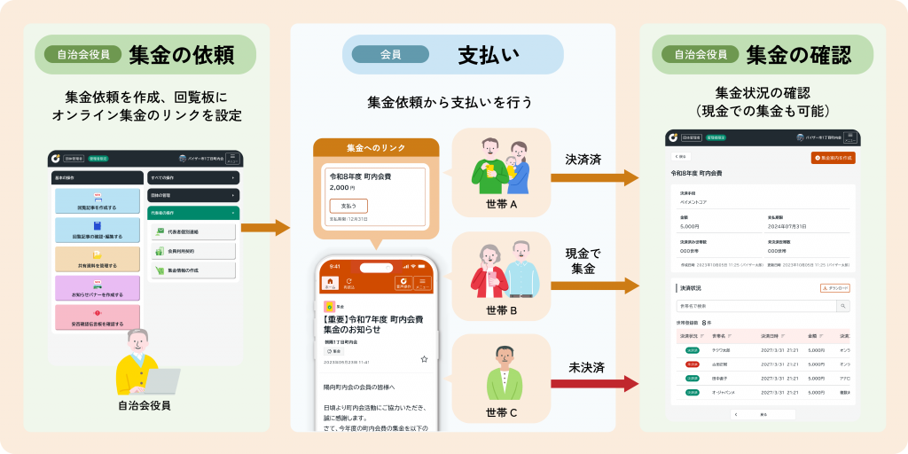この連携により会費集金業務を効率化する新機能「集金補助・世帯管理機能」が実装され、自治会が抱える「会費集金の負担」を、オンライン決済と世帯管理を一体化した形で軽減できるようになります。